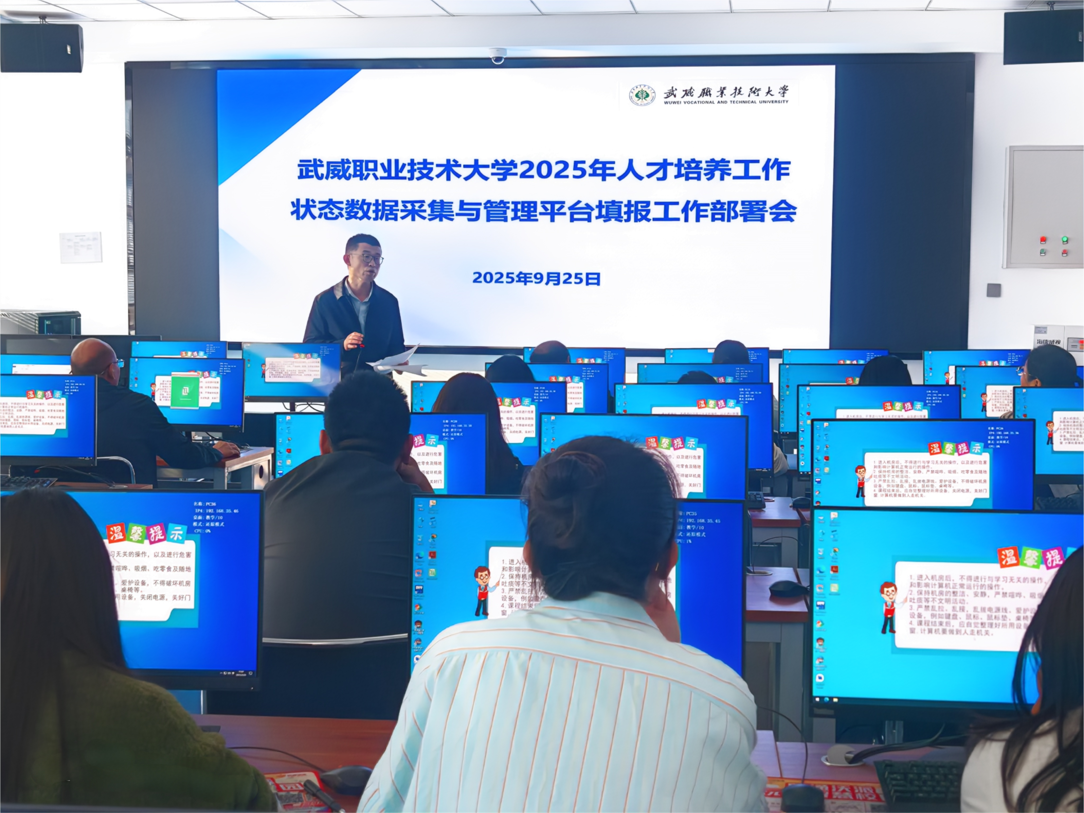 为深入贯彻落实教育部职成司《关于做好职业教育2024-2025学年数据采集工作的通知》精神,根据《甘肃省教育厅关于开展全省职业教育2024—2025学年信息数据采集工作的通知》要求,确保学校2025年人才培养工作状态数据采集工作高效、有序开展。9月25日,教务处在笃行楼3楼机房组织召开学校2025年人才培养工作状态数据采集工作部署会议。教务处、各学院(部)数据填报相关工作人员参加会议。