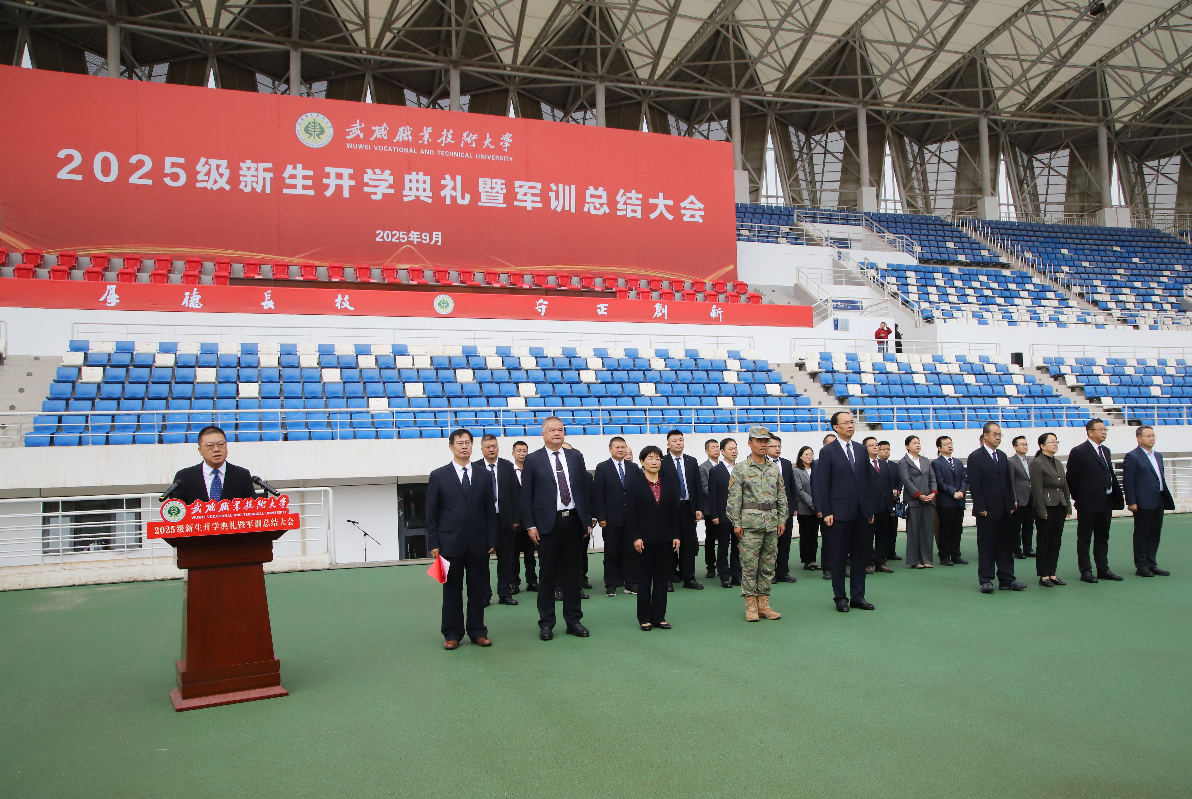 淬火青春,逐梦远航。9月21日,武威职业技术大学在体育场隆重举行2025级新生开学典礼暨军训总结大会。党委书记王宏、校长李海军出席会议并讲话,军训总教官翟波涛中校,学校领导及部门、学院中层干部,承训部队官兵,教师代表和2025级全体新生参加大会。党委副书记、副校长张开礼主持会议。