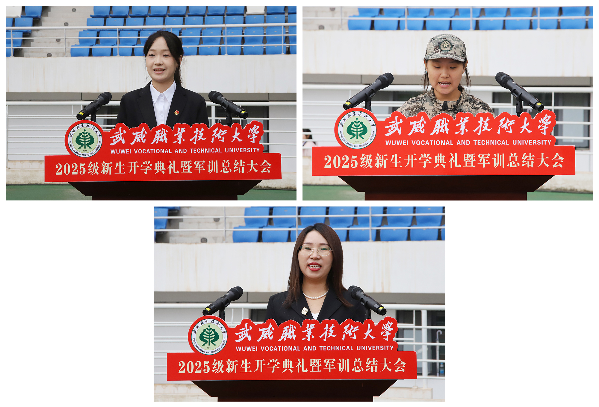 新生代表信息技术学院2025级物联网本科专业学生胥媛,教师代表2025年武威市优秀教师、护理学院王艳丽,在校生代表艺术与教育学院2023级学前教育专业潘怡彤先后发言,分享了她们各自在工作、学习中的心得,勉励大家要树立远大理想、始终追求卓越、保持军训底色、珍惜求学时光,不负青春、不负时代。
