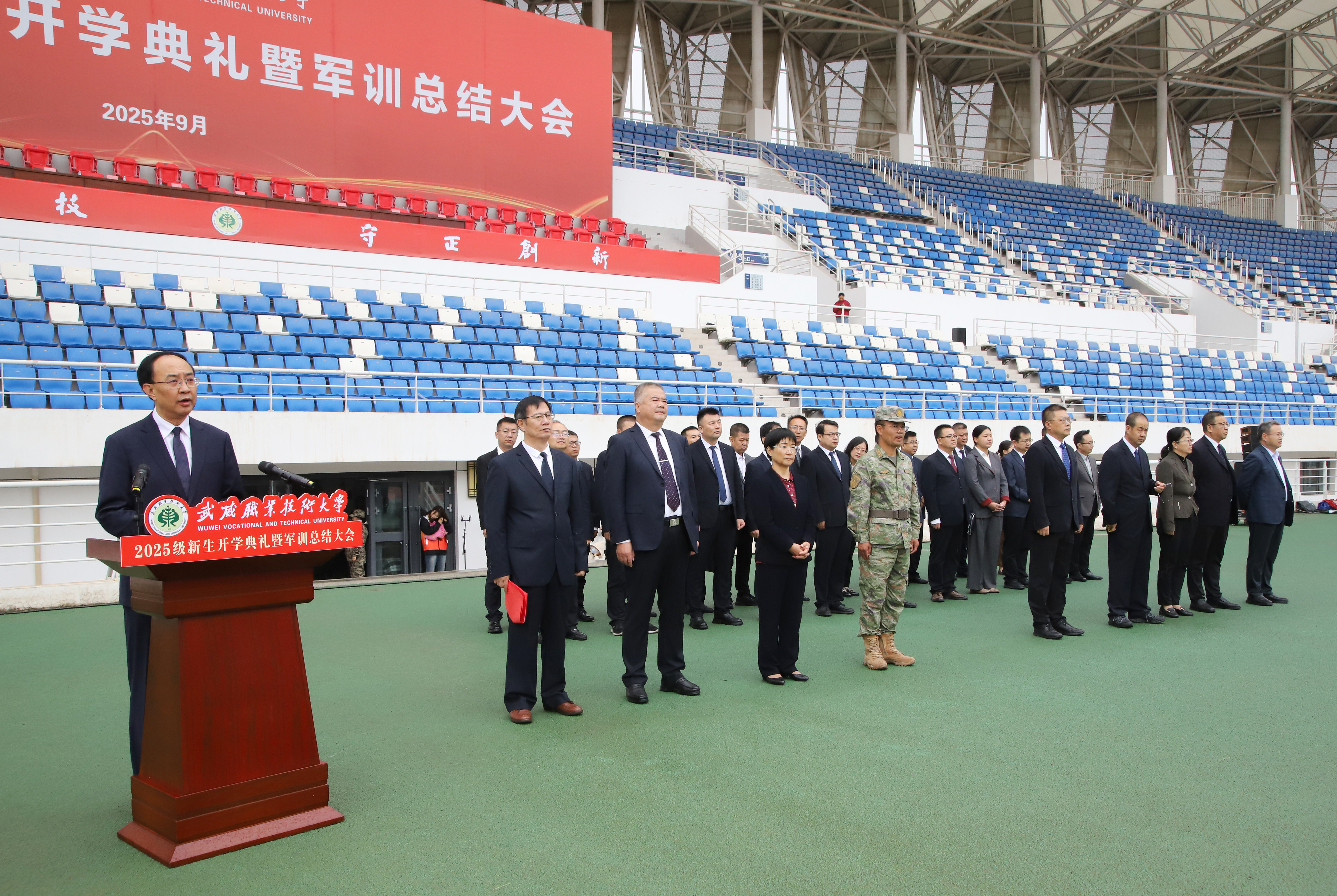 淬火青春,逐梦远航。9月21日,武威职业技术大学在体育场隆重举行2025级新生开学典礼暨军训总结大会。党委书记王宏、校长李海军出席会议并讲话,军训总教官翟波涛中校,学校领导及部门、学院中层干部,承训部队官兵,教师代表和2025级全体新生参加大会。党委副书记、副校长张开礼主持会议。