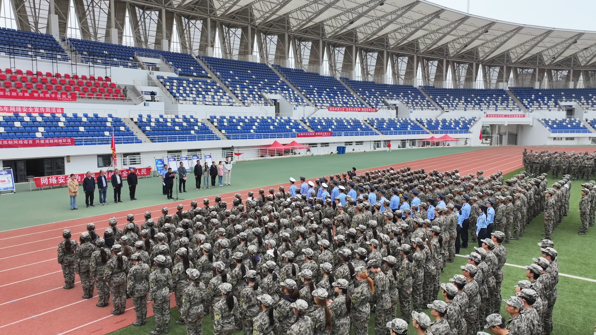 9月18日,武威市公安局网安支队联合武威职业技术大学在学校体育场举办2025年网络安全宣传周集中宣传活动。信息技术学院组织全体师生参加了此次活动,活动以“网络安全为人民,网络安全靠人民——以高水平安全守护高质量发展”为主题,旨在进一步提升广大师生的网络安全意识和防护技能,营造清朗有序的校园网络环境。武威市公安局网安支队支队长张建军,学校网络安全与信息技术中心工作人员,各学院辅导员现场参加活动。