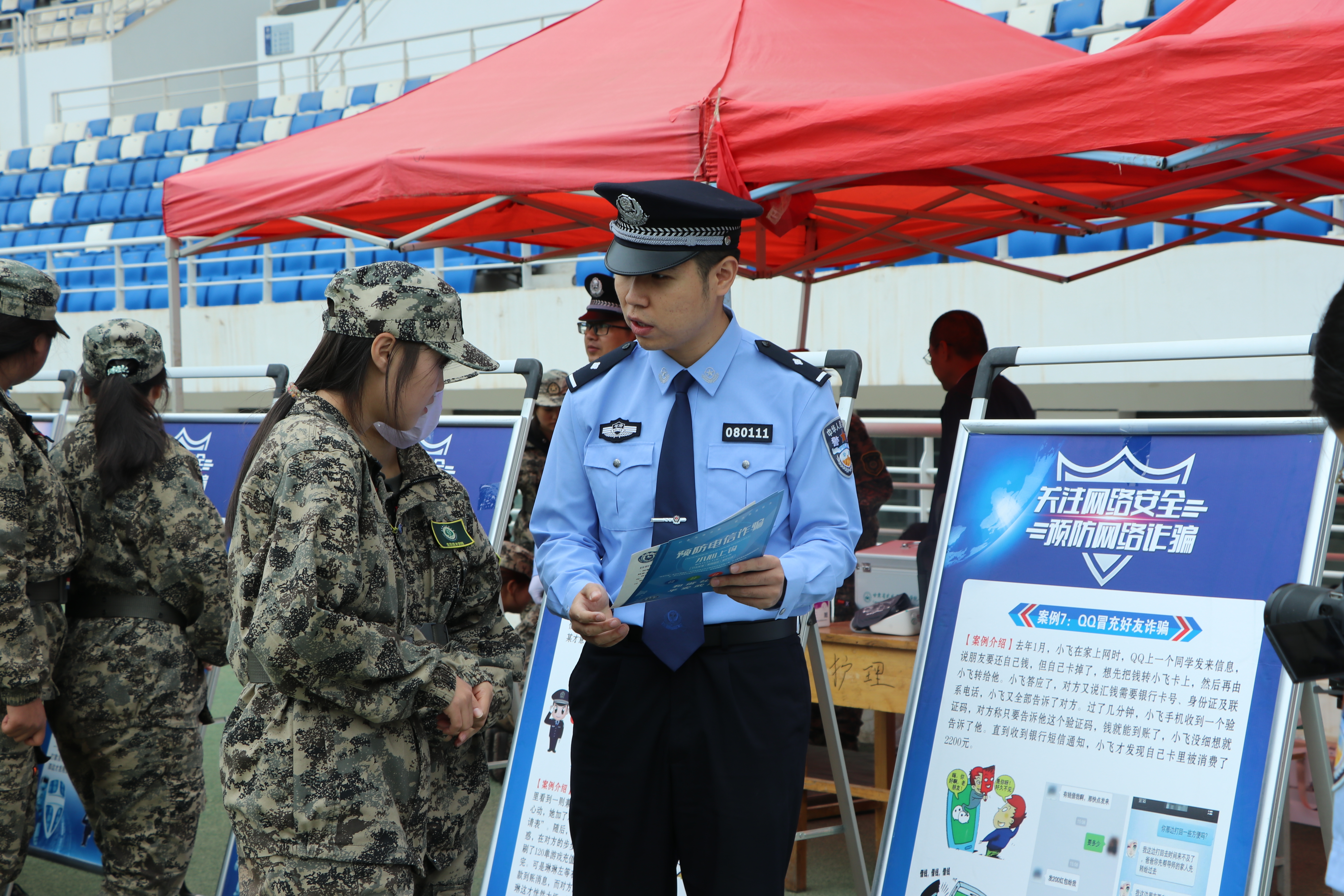 活动现场设置了“网络安全主题展”,通过图文展板、宣传彩页等形式,集中展示《网络安全法》《数据安全法》《个人信息保护法》等法律法规,以及AI换脸诈骗、网络谣言治理、校园贷陷阱等热点内容。市公安局民警与学校网络安全与信息技术中心工作人员现场发放《大学生防骗手册》《个人信息保护小贴士》等宣传资料,并耐心讲解宣传资料中的重点内容。