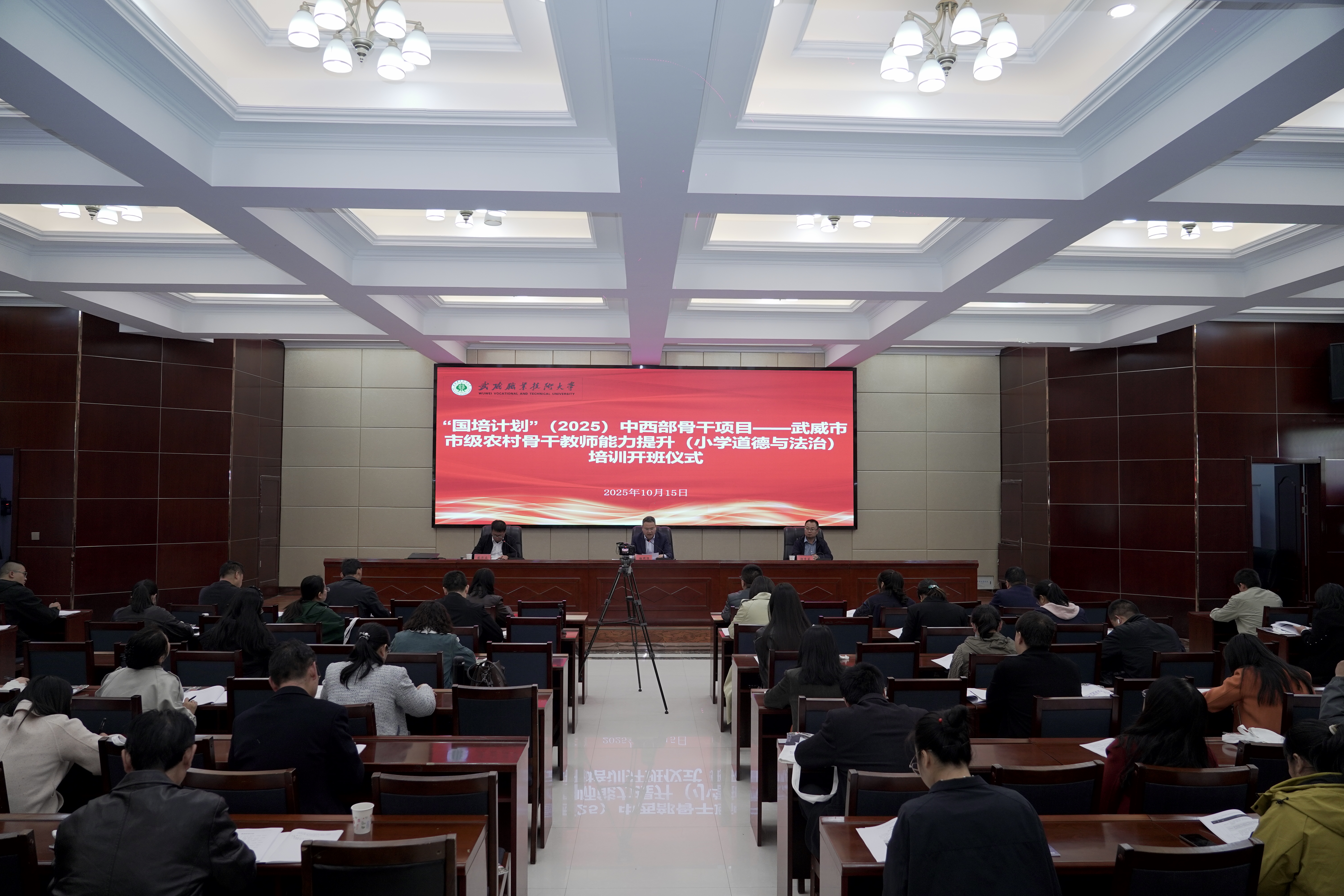 10月15日,由武威市教育局主办、武威职业技术大学承办的“国培计划”(2025)中西部骨干项目——武威市市级农村骨干教师能力提升(小学道德与法治)培训班在学校行树楼北侧报告厅正式开班。学校党委委员、副校长伍国强出席开班仪式。培训组织管理工作人员及60名参训骨干教师共同参加。开班仪式由学校国际合作交流处副处长蔡济众主持。